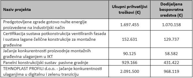 - Tvrtka Tehnoplast Profili za proizvodnju, trgovinu i usluge je korisnik pet projekata financiranih sredstvima Europskog fonda za regionalni razvoj u okviru programa Konkurentnost i kohezija 2014. - 2020. Radi se o sljedećim projektima: Predgotovljene zgrade gotovo nulte energije proizvedene na industrijski način, Certifikacija sustava potkonstrukcija ventiliranih fasada i sustava lagane čelične konstrukcije za montažne građevine, Jačanje konkurentnosti proizvodnje montažnih građevina ulaganjem u IKT, Panelni konstrukcijski sustav pasivne gradnje, Tehnoplast profili d.o.o. - jačanje konkurentnosti ulaganjima u digitalnu i zelenu tranziciju.
