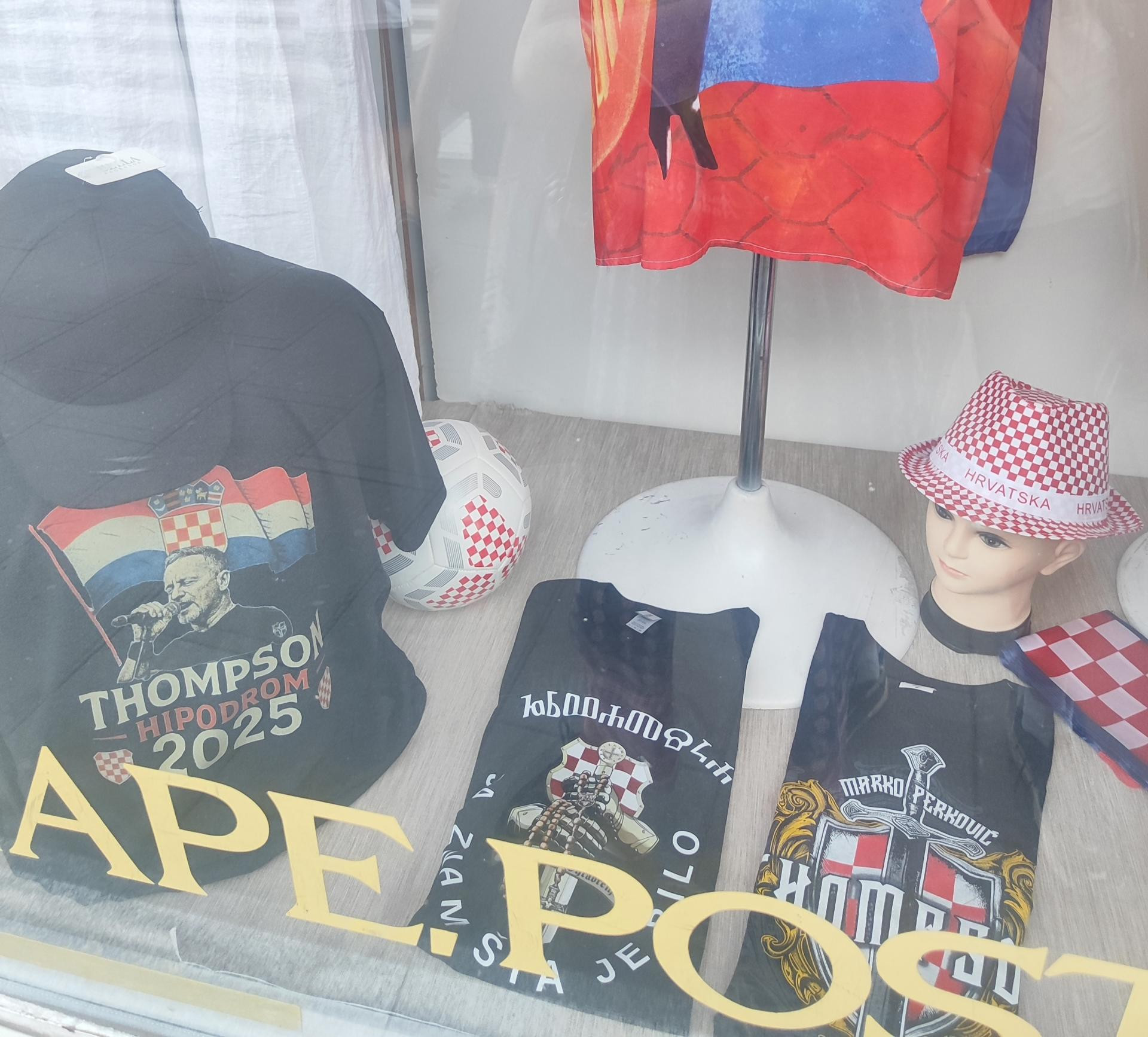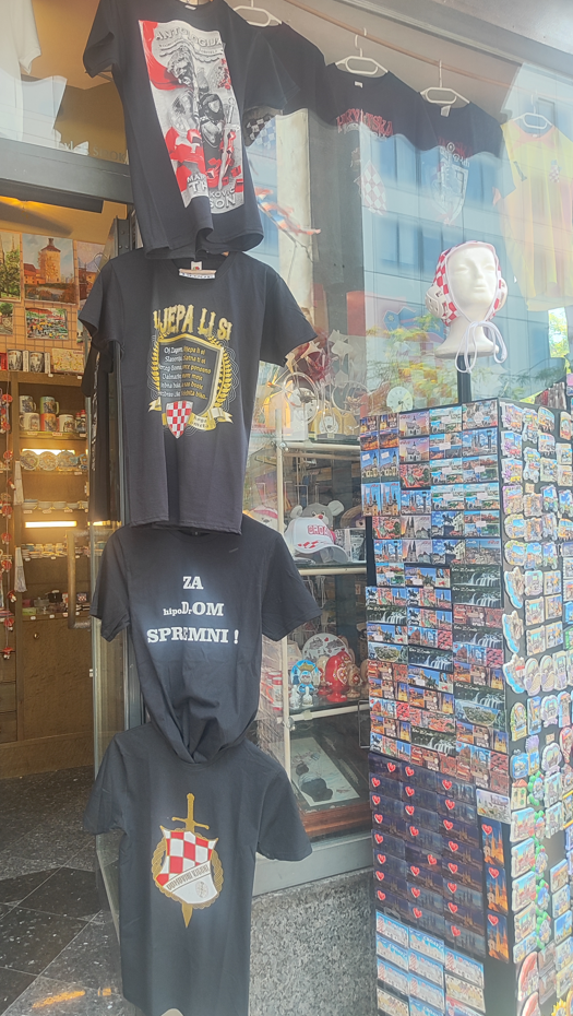 I jedan manji dućan na Kvaternikovom trgu ušao je u ovaj lukrativni biznis. Iz izloga se mogu vidjeti 4 modela, sadržajem povezanim uz sam koncert u Zagrebu. "ZA DOM I HIPODROM SPREMNI" natpis je na majici koja bi, da je riječ o natjecanju u brojnosti motiva, zasigurno odnijela pobjedu, jer tu su stali još i: Zagrebačka katedrala, pleter, šahovnica s prvim bijelim poljem, grb grada Zagreba, ban Josip Jelačić, AI generirani srednjovjekovni ratnik u žaru borbe, te broj 500.000. Ostale majice nisu toliko elaborirane: "Marko Perković Thompson", "Thompson Hipodrom 2025", "Ako ne znaš šta je bilo" i natpis na glagoljici motivi su između kojih možete birati, sve po cijeni od 20 eura.