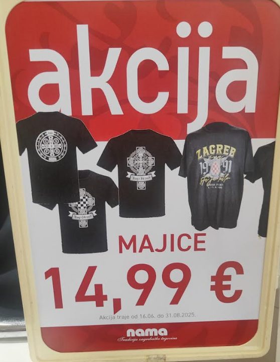 Vjerovali ili ne, za Thompsonov koncert najjeftinije ćete se obući u Nami. U njihovoj ponudi možete birati između četiri modela majica za 14,99 eura svaka. Majice su, dakako, opremljene prigodnim atributima: natpisom "Bog i Hrvati" strateški pozicioniranim ispod šahovnice s prvim bijelim poljem, motivima starohrvatskog pletera i križa sv. Benedikta. Jednu od majica u Naminoj ponudi krase i natpisi "Zagreb zna šta je bilo - 1991", uz još jedan; "Semper primus 4.-7. 1995." Ova promotivna akcija kultne zagrebačke trgovine koja, kako na njihovoj internetskoj stranici stoji, baštini tradiciju starih bečkih trgovaca, traje od 16. lipnja do 31. kolovoza.