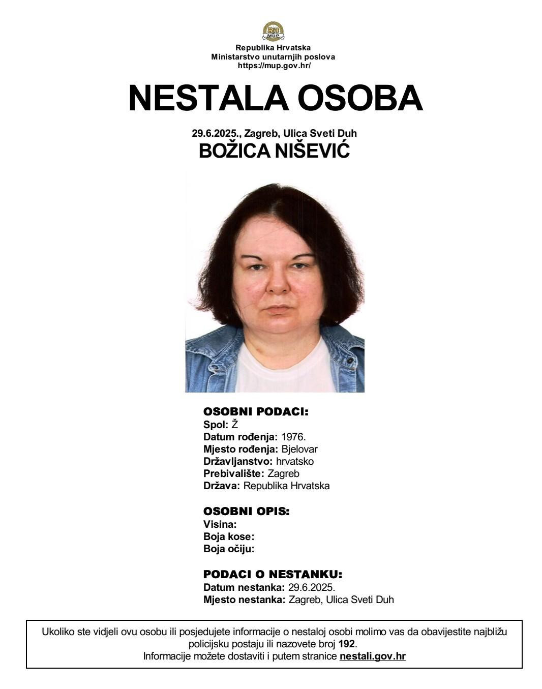 Već četiri dana nitko ne zna gdje je 49-godišnja Božica Nišević, koja se, iz samo njoj znanih razloga, udaljila u nepoznatom pravcu iz jedne ustanove u Zagrebu.