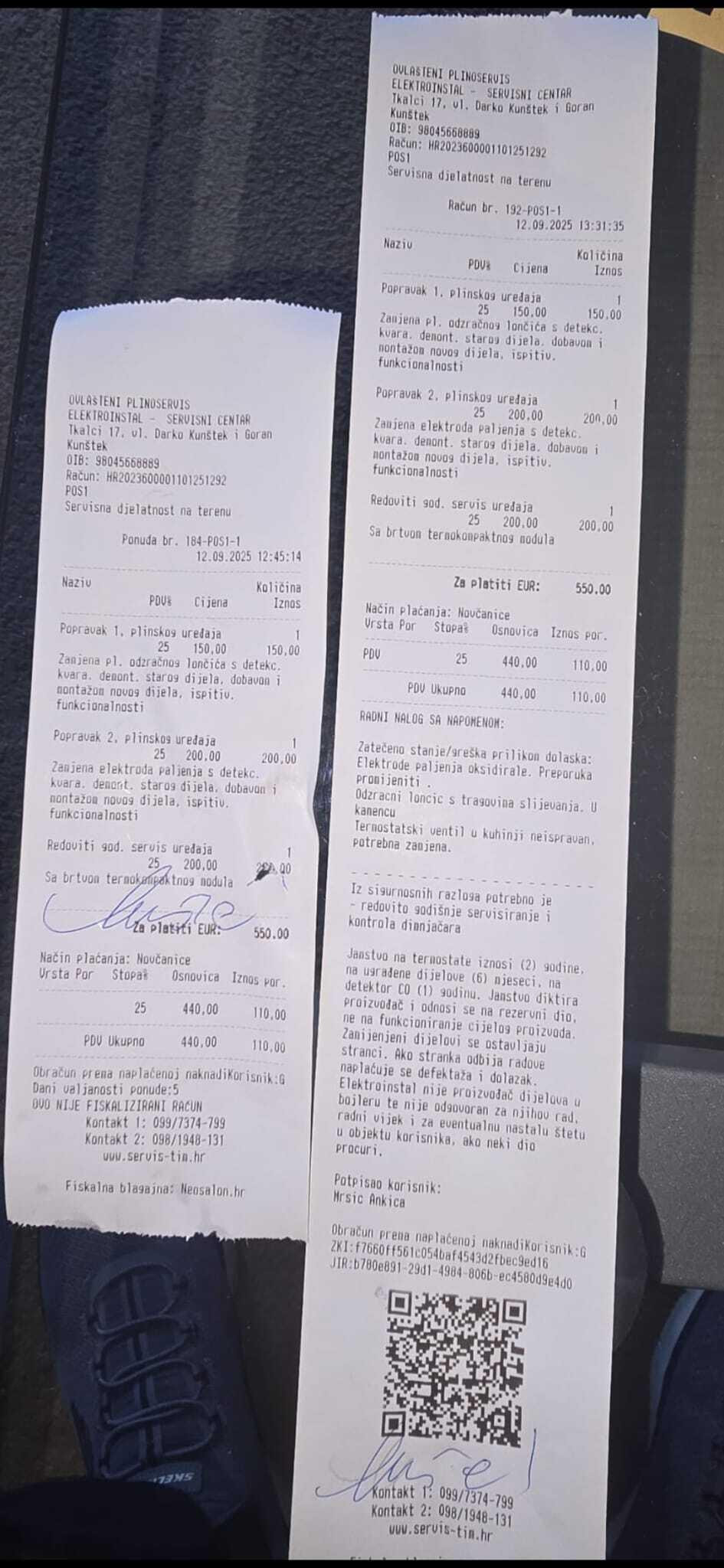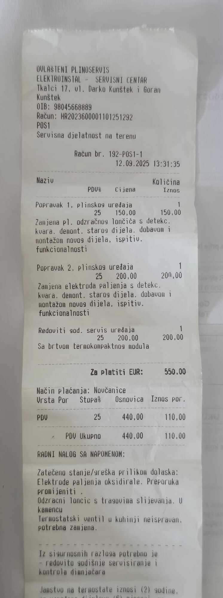 Za popravak plinskog uređaja, odnosno zamjenu plinskog odzračnog čepića, serviser Elektroinstala je zaračunao 150 eura. Još 200 eura naplatio je zamjenu elektrode paljenja, te na kraju 200 eura za redoviti servis.
