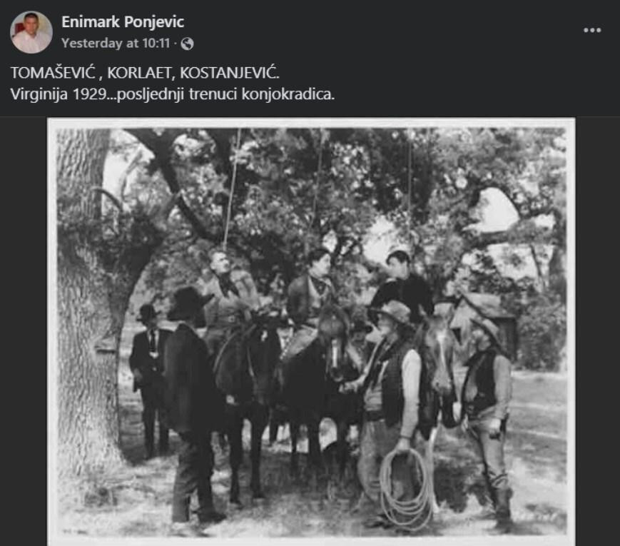 Ponjević je objavio crno-bijelu povijesnu fotografiju koja prikazuje vješanje trojice muškaraca na drvetu, uz opis: "Virginia 1929... posljednji trenuci konjokradica." Međutim, ono što je izazvalo posebnu zabrinutost jest natpis iznad fotografije na kojem su ispisana prezimena: Tomašević, Korlaet, Kostanjević – što se tumači kao jasna aluzija na zagrebačkog gradonačelnika Tomislava Tomaševića, njegova zamjenika Luku Korlaeta i ravnatelja Ustanove Upravljanje sportskim objektima Grada Zagreba Kostu Kostanjevića.