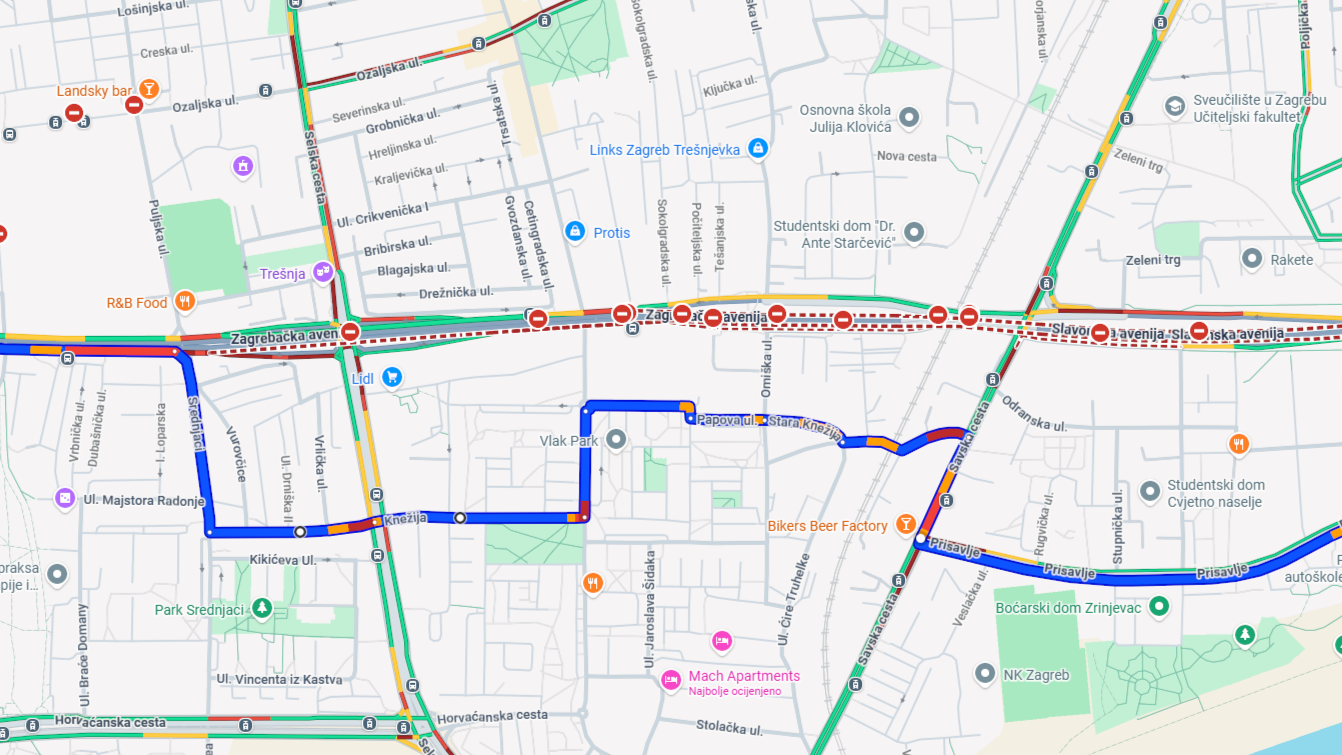 Nakon izlaska vam predstoji vožnja do odredišta, ali ovaj put bez da ste se i u jednom trenutku našli usred kolapsa. Prema računici Googleovog prometnog servisa, ovaj put zaobilazi sve kritične točke nastale novom regulacijom i prepolovljuje vrijeme potrebno za prelazak Savske. Stoga je još zanimljivije što predstavljenu rutu kao alternativu ne nudi nijedan od popularnijih servisa za navigaciju, već se ona mora ručno odrediti.