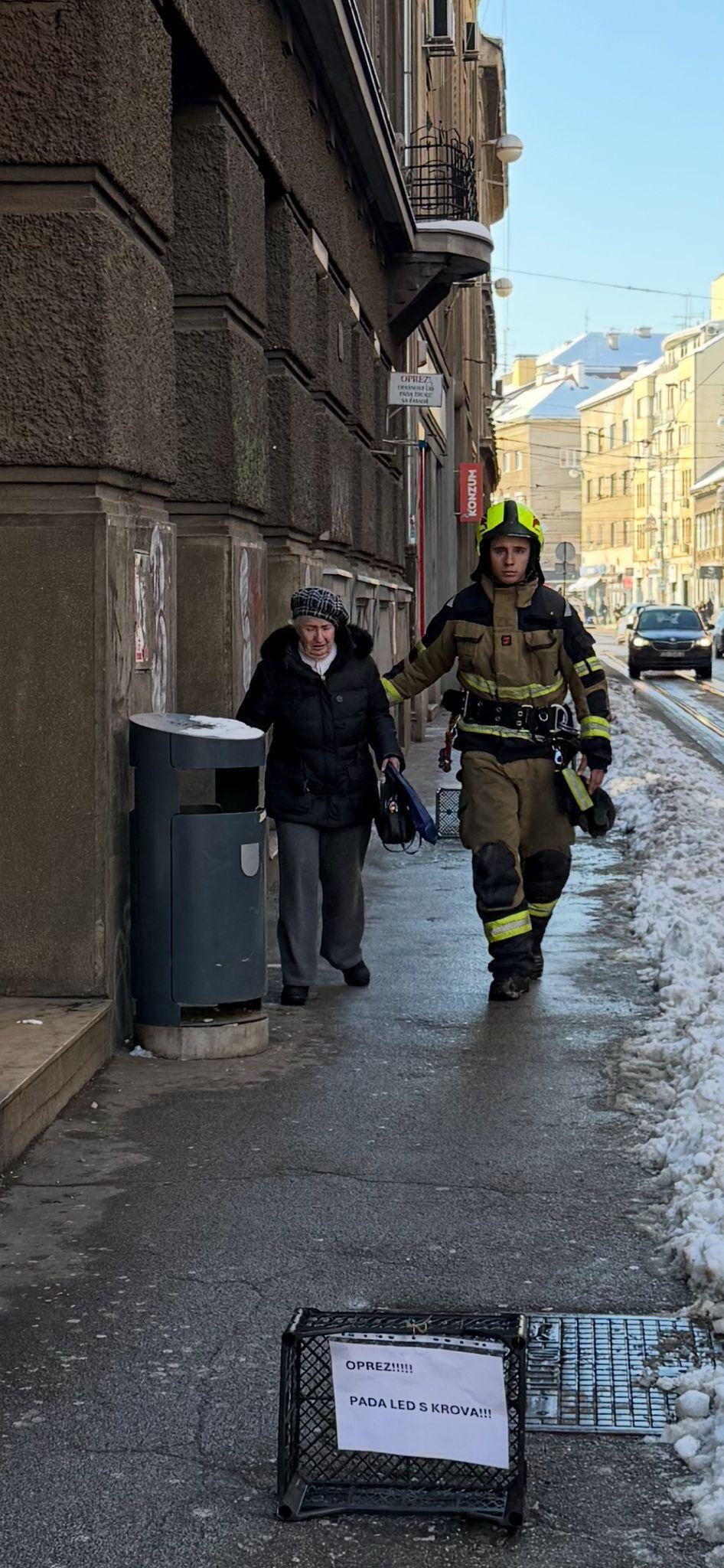 Tijekom uklanjanja siga s vrha stambene zgrade, jedan je vatrogasac pažljivo proveo stariju gospođu ispod opasnog područja, pazeći pritom da sigurno prijeđe ulicu i da joj ne prijeti nikakva opasnost.