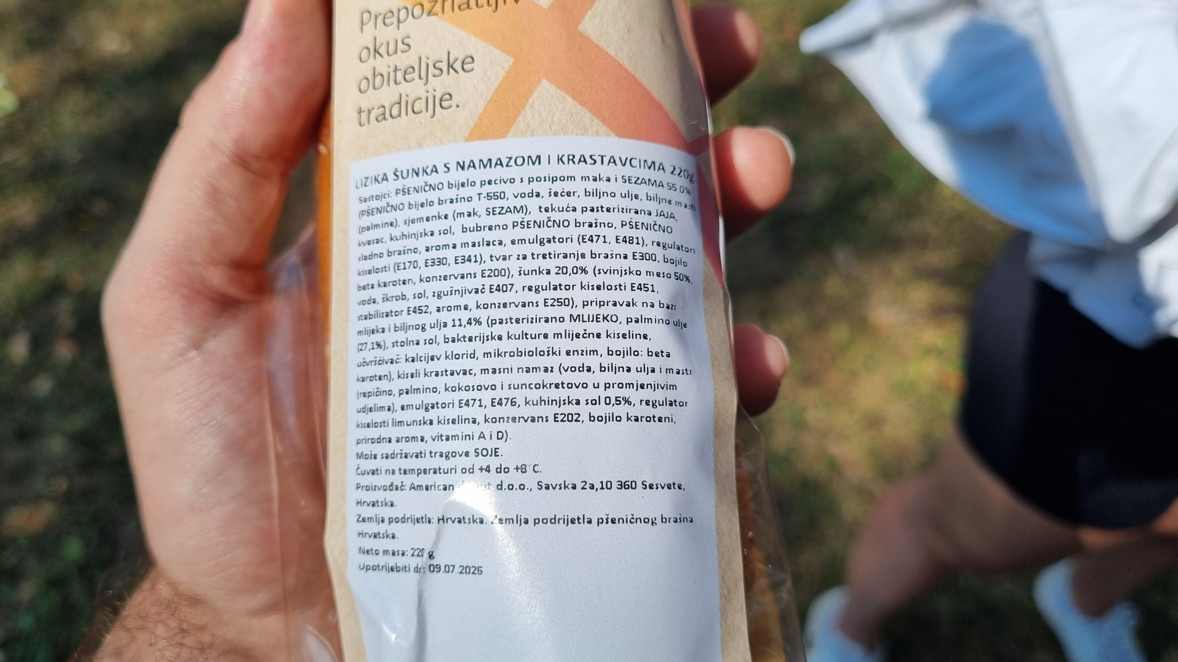 Riječ je inače o sendviču šunka-sir s dodatkom krastavaca i masnim namazom stvorenim spajanjem čak četiriju vrsta ulja. Službena deklaracija na pakiranju kaže da je težak 220 g i kako je zemlja podrijetla Hrvatska, kao i podrijetlo brašna od kojeg je napravljen. Kušali smo ga prije isteka roka.